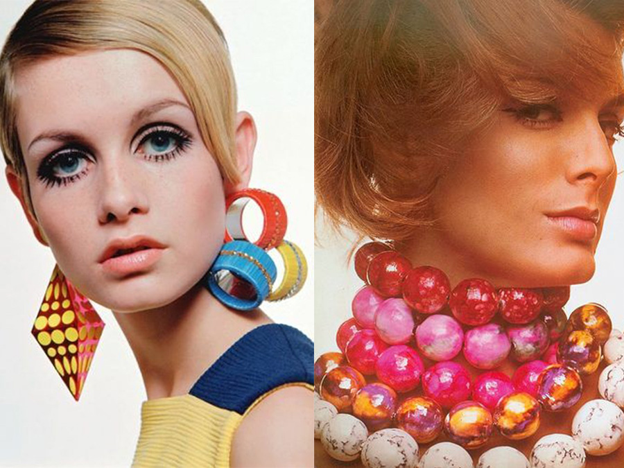 At the beginning of the decade, glamour reigned supreme with glitzy, gold designs and feminine pearls, as seen on silver screen icon Audrey Hepburn (loved her!). However, as the decade moved forward, and mod fashion caught on, jewellery became all about eye-catching plastic creations. These bold accessories were influenced by pop art and featured striking designs, geometric shapes and bright colours. Key pieces included large earrings, big rings and bangles.