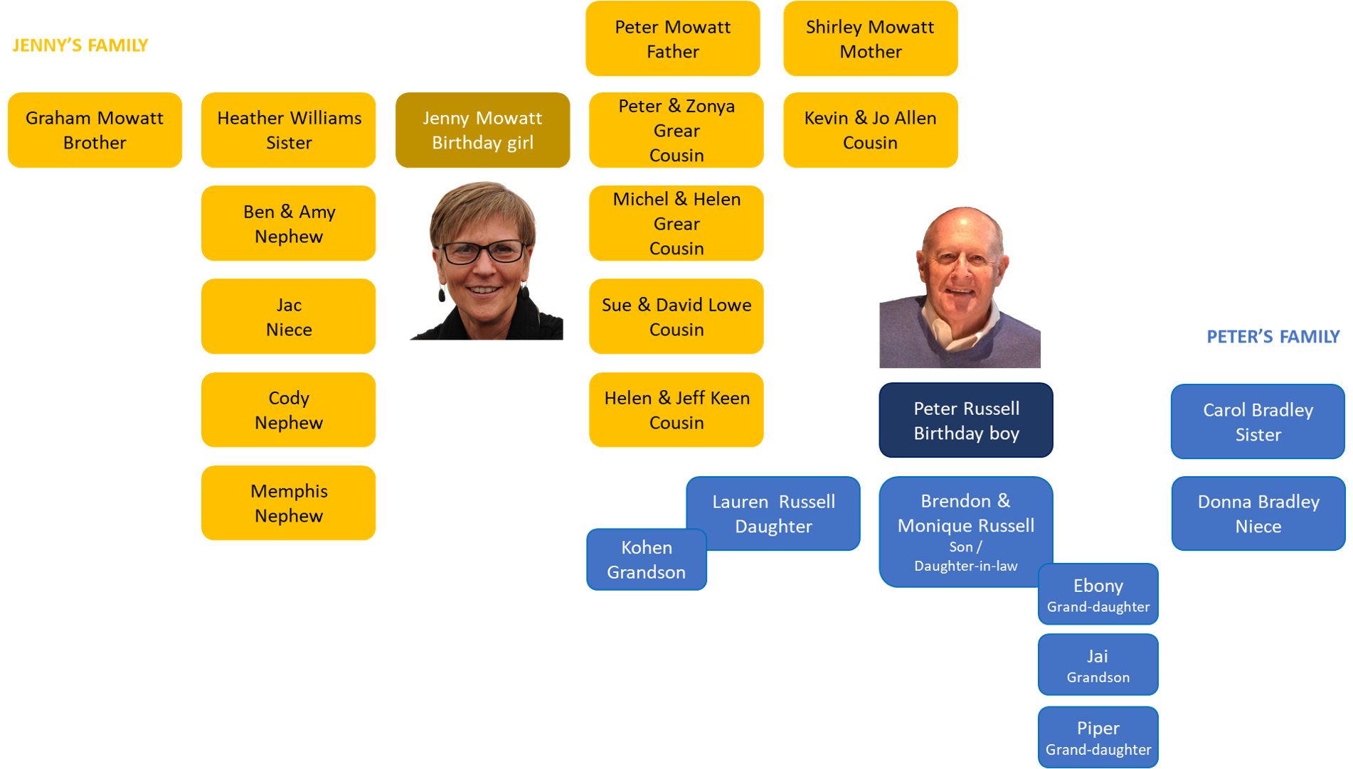 Yes, you family members should know who you are, either a Mowatt or a Russell and their derivatives by marriage. And we have extended family attending representing the Grears, Lowes, Keens, Allens and Bradleys. You can see them all in the graphic that Jenny has constructed here and their relationship to us.